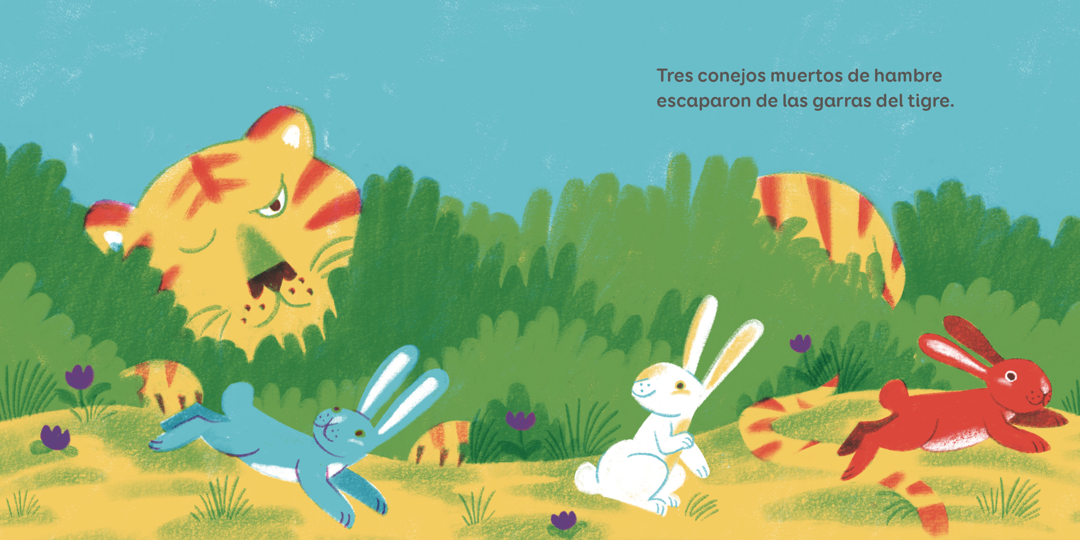 Este libro en cartoné de Triunfo Arciniegas e ilustrado por Paula Ortiz narra las aventuras de tres conejos que, escapando de su depredador, viven la alegría de descubrir el mundo y superar las dificultades con la mejor actitud. Las ilustraciones de Ortiz son tan divertidas como el texto y tienen su mismo poder narrativo.