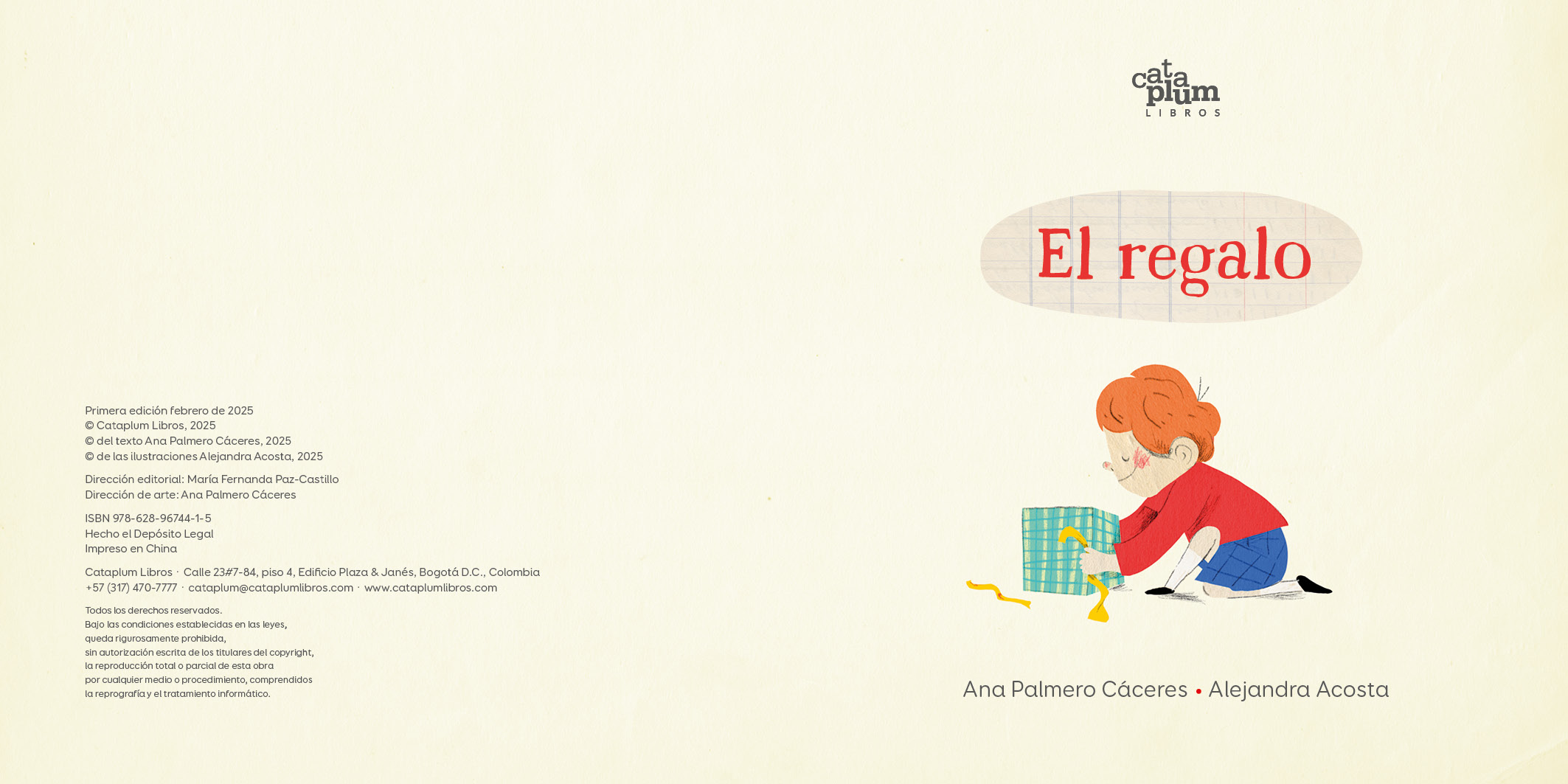 El regalo trae de regreso a los mismos personajes de Yo no fui en una situación diferente pero común en muchas familias: la llegada de un ruidoso regalo (“un lindo tambor”) para todos menos para quien lo recibe. Las ilustraciones de Alejandra Acosta, expresivas y llenas de humor y picardía, van mucho más allá del texto demostrando que siempre el más pequeño de la casa puede encontrar un cómplice en sus pilatunas.